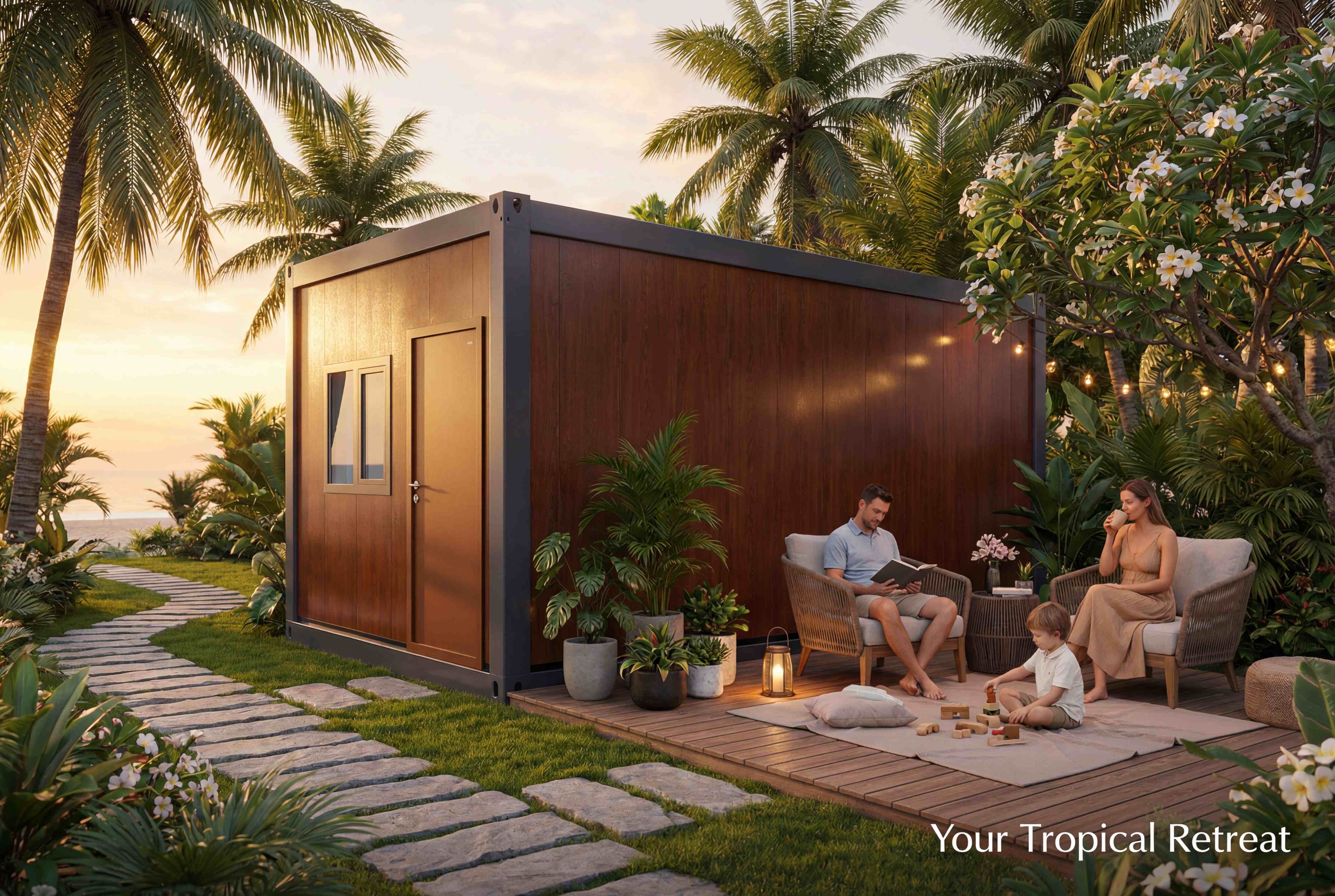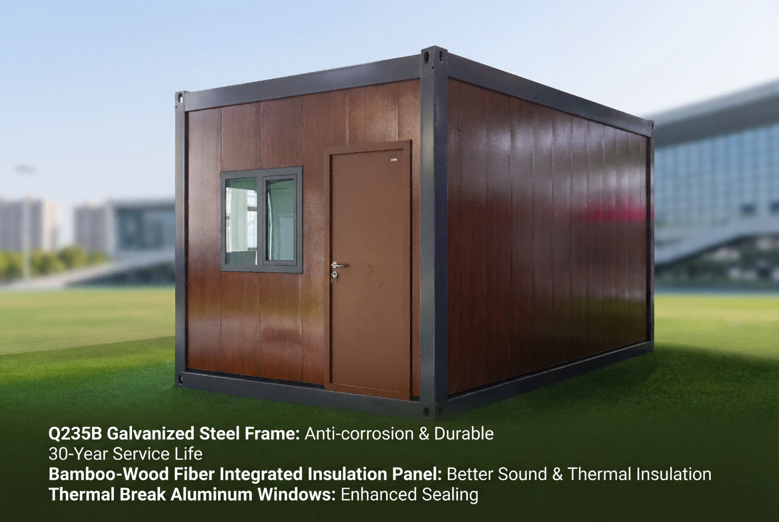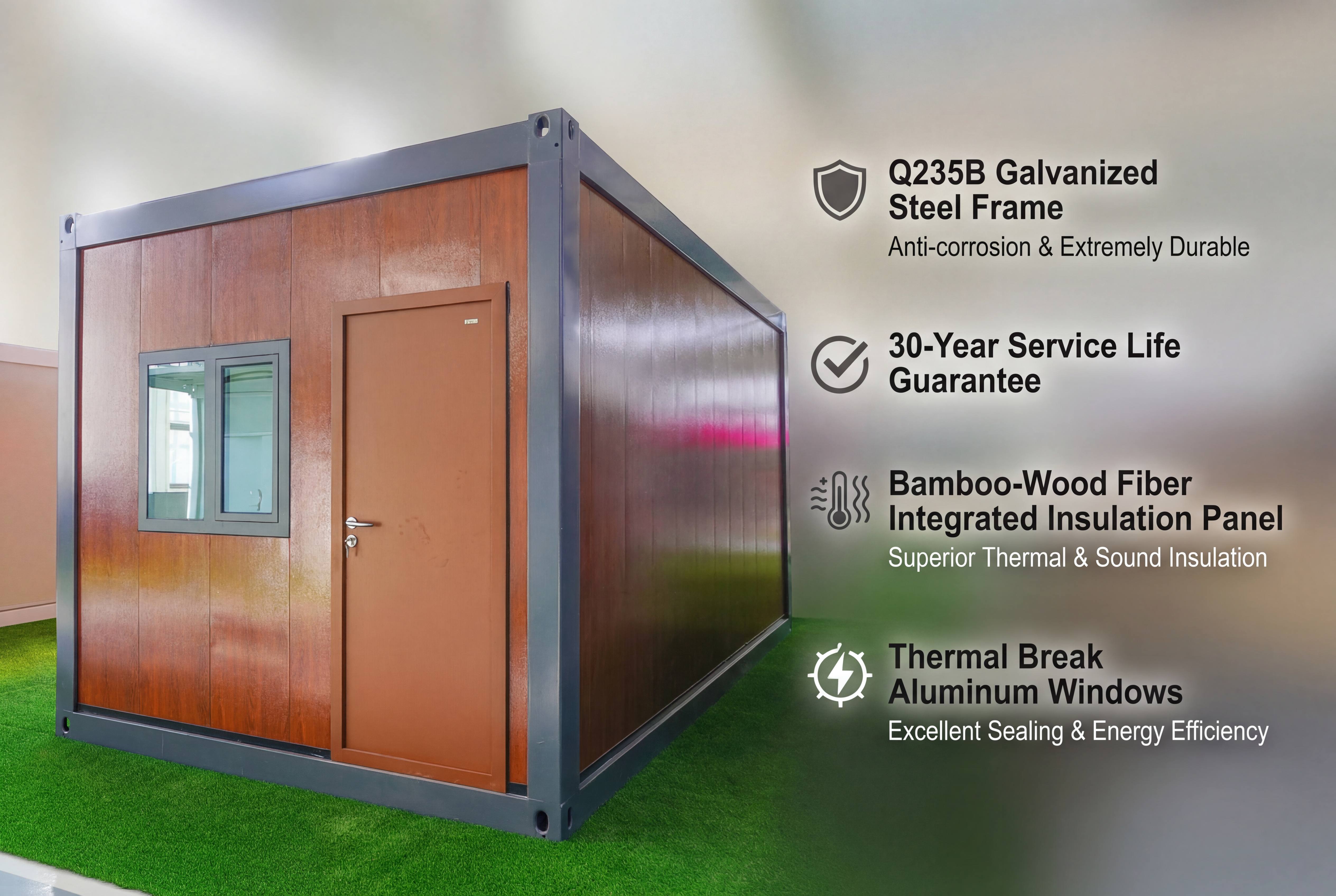 - ✅External Size:(L) 5990mm× (W)2500mm × (H)2896 - ✅Weight/Volume: 1.4 t / 8 m³ - ✅ Upgrade Material: Graphite Bamboo Fiber Panel (Eco, Soundproof) - ✅ Built-in Bathroom (Move-in Ready) - ✅ 8 Units Loaded in 40ft HC: Optimized for Luxury Bulk Transportation - ✅ 30-Year Service Life: Q235 Steel Frame + Premium Components - ✅ Customization: Colors, Accessories & Interior Layout -🔵Minimum Order Quantity: 1 units (small-batch customization supported) -🔵Production Cycle: 12 days for 500 units -🔵Shipping Terms: FOB/CIF (Tianjing Port); supports door-to-door delivery for bulk orders