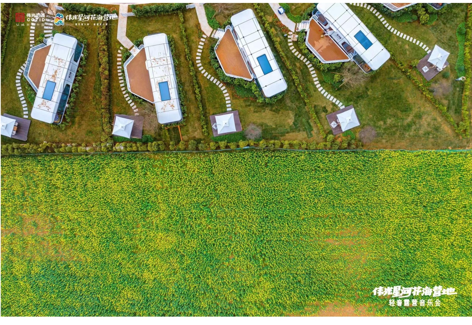 Strolling along the winding wooden plank road, looking over capsule roofs, an endless flower sea stretches out.